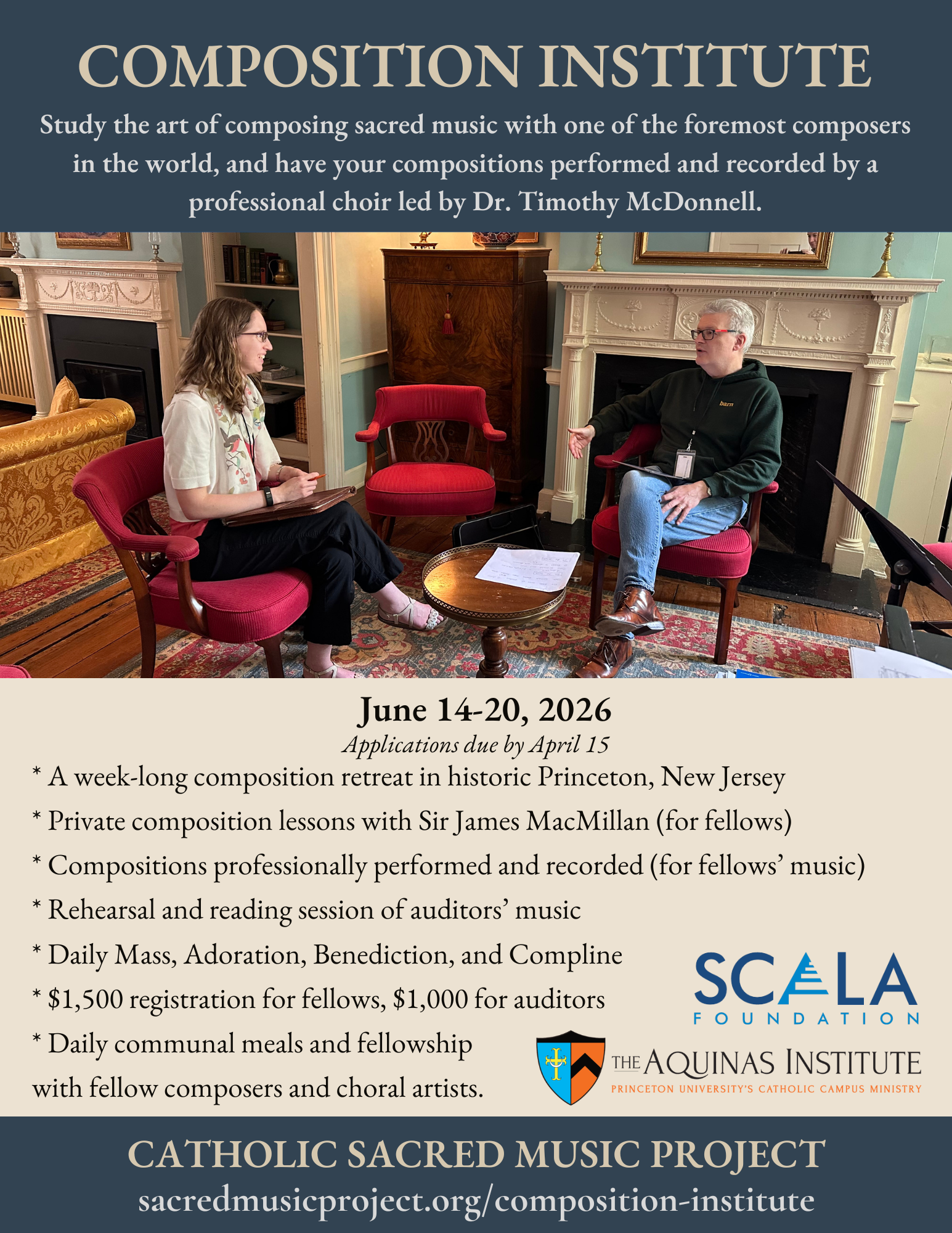 The Composition Institute of the Catholic Sacred Music Project is a unique intensive event for both emerging and established composers to study the craft of composing sacred music with world renowned composers in order to cultivate new compositions to add to the Church's treasury of sacred music. Composers selected for the 2026 Composition Institute will have the opportunity to study with Sir James MacMillan in a retreat-like environment in the walkable historic town of Princeton, New Jersey, and to have their works performed and recorded by a professional choir at St. Paul’s Church in Princeton on June 19th.